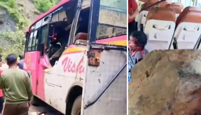 शिमला। हिमाचल प्रदेश में जिला शिमला के रामपुर में बड़ा हादसा पेश आया है। बिथल कालीमिट्टी के पास अचानक पहाड़ी से चट्टानें निजी बस को चीरते हुए सवारियों पर आ गिरीं। हादसा बेहद भयावह रहा। चट्टानें बस का आधा हिस्सा तोड़कर अंदर पहुंच गई।