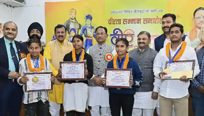 रायपुर, 26 दिसंबर 2025. मुख्यमंत्री श्री विष्णु देव साय आज वीर बाल दिवस के अवसर पर अपने निवास कार्यालय में छत्तीसगढ़ सिविल सोसाईटी द्वारा आयोजित वीरता सम्मान समारोह में शामिल हुए। उन्होंने इस अवसर छत्तीसगढ़ प्रदेश के 4 वीर साहसी बालकों को सम्मानित किया जिसमें साहिब फतेह सिंह वीरता पुरस्कार श्री प्रेमचन्द साहू,साहिबजादा जोरावर सिंह वीरता पुरस्कार कु अंशिका साहू साहिबजादा जुझार सिंह वीरता पुरस्कार कु कांति सिंह, साहिबजादा अजीत सिंह वीरता पुरस्कार श्री ओम उपाध्याय को प्रदान किया गया।