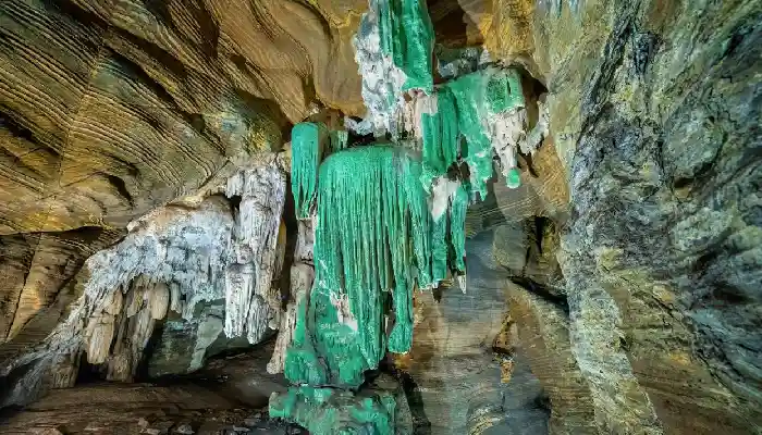 ग्रीन गुफा तक पहुंचने का मार्ग बड़े-बड़े पत्थरों से होकर गुजरता है। गुफा में प्रवेश करते ही सूक्ष्मजीवी जमाव से ढकी हरी दीवारें पर्यटकों को आकर्षित करती हैं। आगे बढ़ने पर एक विशाल कक्ष दिखाई देता है, जहां से भीतर की ओर चमकदार और विशाल स्टैलेक्टाइट्स तथा फ्लो-स्टोन (बहते पानी से बनी पत्थर की परतें) देखने को मिलती हैं, जो गुफा की प्राकृतिक भव्यता को और भी बढ़ा देती हैं।